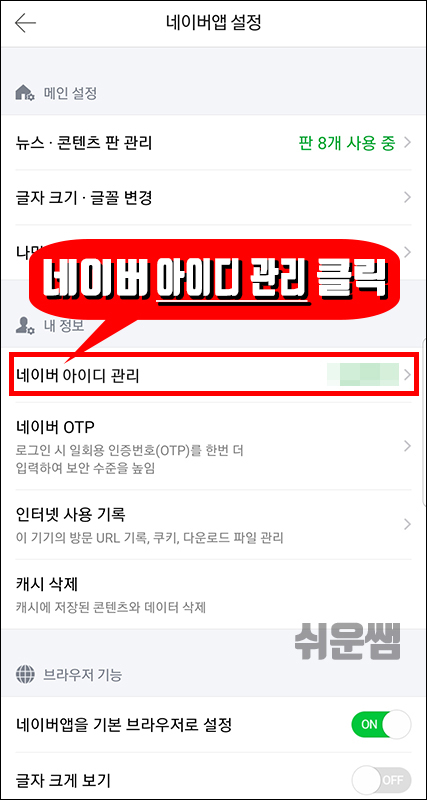 7. [네이버 아이디 관리] 를 탭하여 선택합니다.