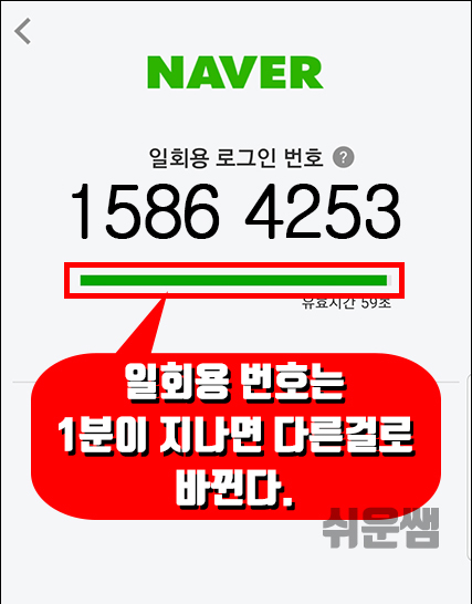 따라서, 1분 안에 이번호를 좀전에 준비해둔 컴퓨터 네이버 [일회용 로그인 번호]입력하는 상자에 입력합니다.