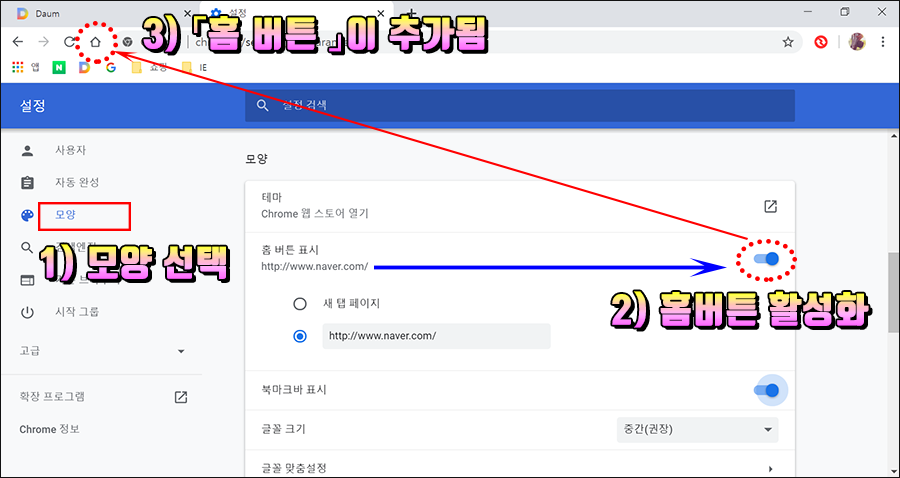 3. 왼쪽 항목에서 1) [모양] 선택 → 2) '홈버튼 표시'옆의 막대를 클릭해서 '홈버튼'을 파랗게 활성화 시켜줍니다. 3) 크롬창 왼쪽 상단에 '홈 버튼'이 추가됩니다.