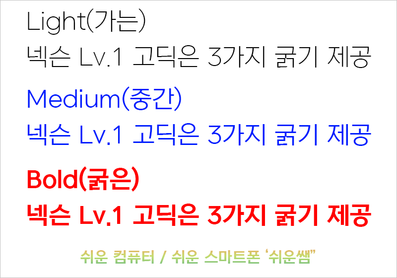 ② 포토샵 등 일부 에서는 폰트선택후, 그 옆 옵션에서 굵기를 별도로 선택해야 합니다.