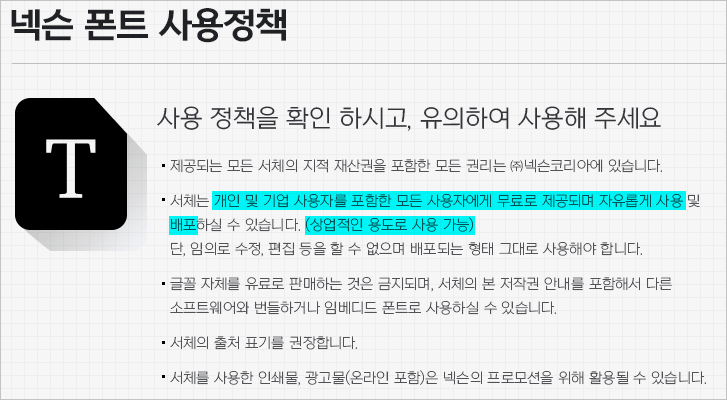 ② 상업적으로 사용가능한 글꼴 - 자유롭게 사용가능한 글꼴이 있는 반면, 폰트저작권자에따라 사용범위에 제한이 있는 글꼴도 많습니다.