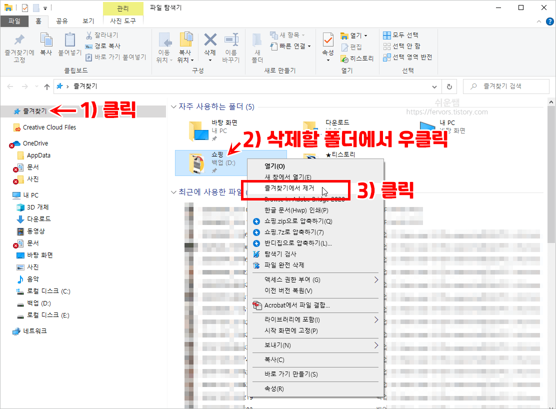 결과) 자주 사용하는 폴더 목록에서 삭제됩니다. 이 목록에서만 삭제되는 것이며, 실제로 폴더가 삭제되는 것은 아닙니다.