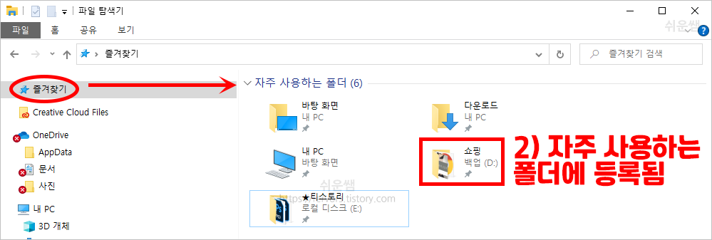 결과) '파일탐색기'의 즐겨찾기를 클릭하면, '자주 사용하는 폴더'목록에 폴더가 추가되었습니다.