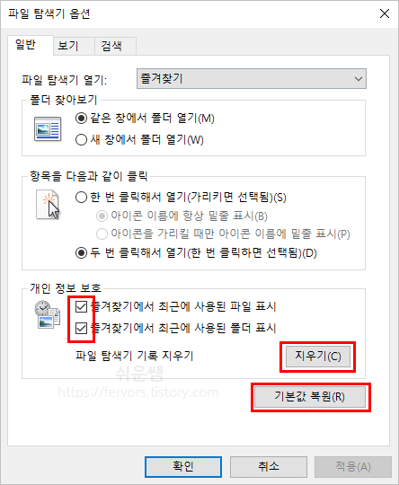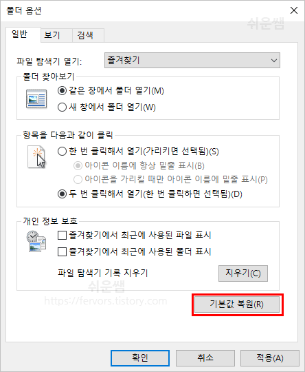 다시 [최근에 사용한 목록]이 표시되게 하려면 위의 방법으로 체크를 다시 하면 됩니다. 또는 [폴더 옵션]대화상자에서 [기본값 복원]을 클릭합니다.