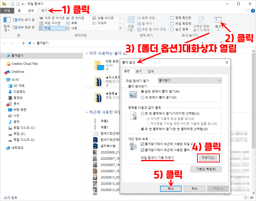 내PC / 파일탐색기를 실행시키고, [보기]를 클릭 → [옵션] 아이콘 클릭 → [폴더 옵션] 대화상자가 나타나면, [지우기]를 클릭합니다.