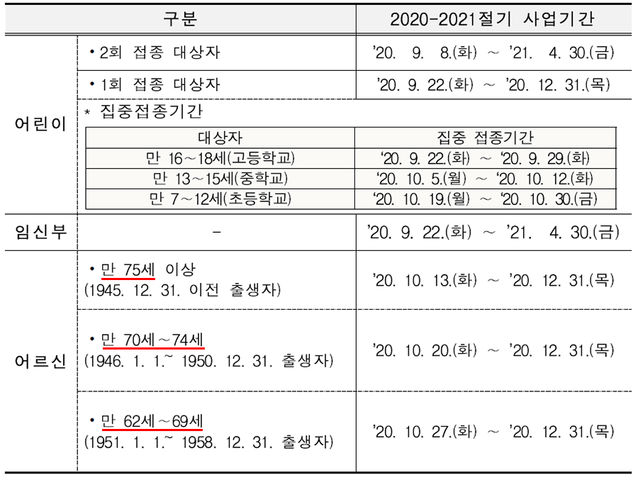 원래도 무료 독감예방접종 대상자도 나이별로 기간이 정해져 있는데, 올해는 무료접종대상도 늘어나고, 접종기간도 세분화되어 보기에 복잡해 보일수도 있을 것 같아 정리해봤습니다.