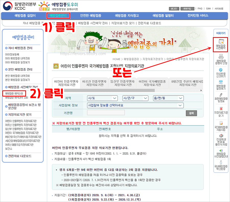예방접종관리→예방접종사전예약관리→예방접종예약신청