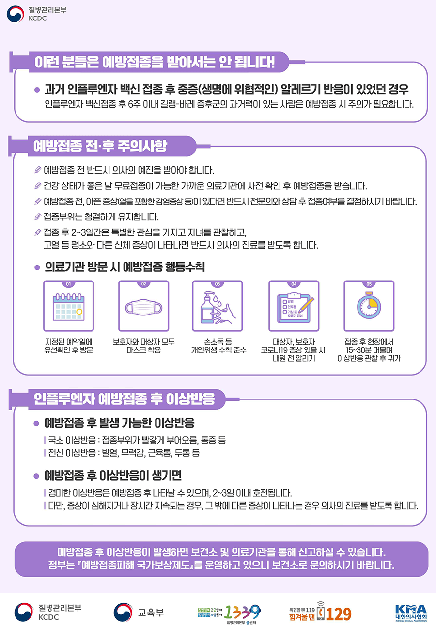 ▶ 접종 2주 후부터 예방효과가 나타나므로 인플루엔자 유행기간을 고려하여 11월까지 접종 완료 권장(뉴스등 언론에서는 10월까지 접종 권장)