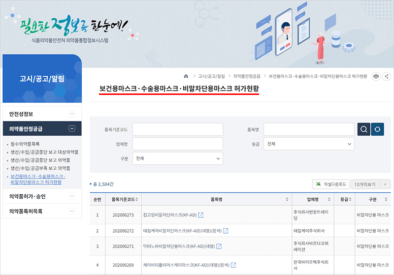 보건용마스크·수술용마스크·비말차단용마스크 허가현황도 식품의약품안전처에서 확인 가능합니다.