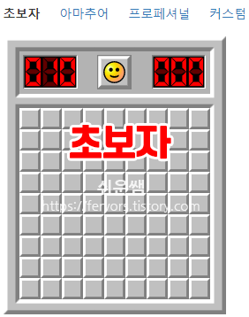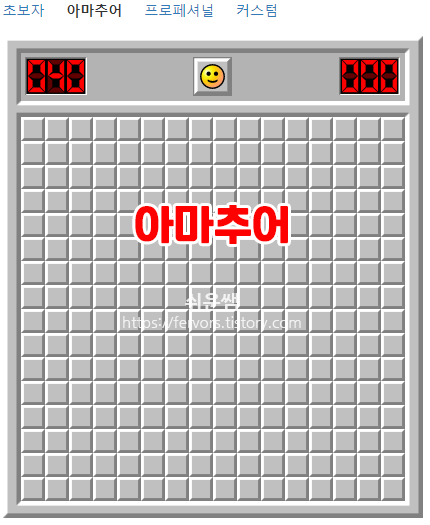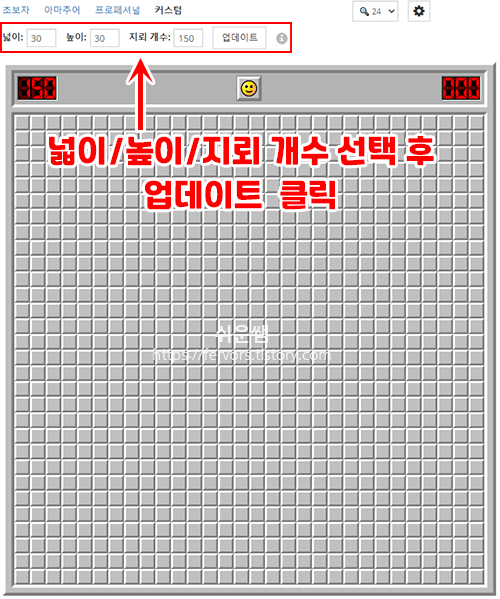 커스텀을 선택하면 넓이, 높이, 지뢰 개수를 선택할 수 있습니다.