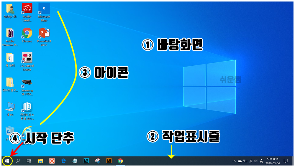 윈도우10 바탕화면 구성 및 용어, 작업표시줄 용어, 시작메뉴 용어