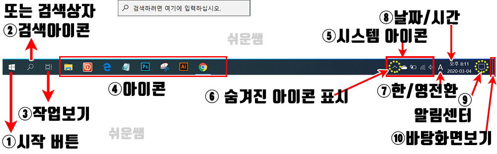 ② 작업표시줄 : 실행중인 프로그램(앱)목록이 표시되며, 각종 정보가 표시되는 부분