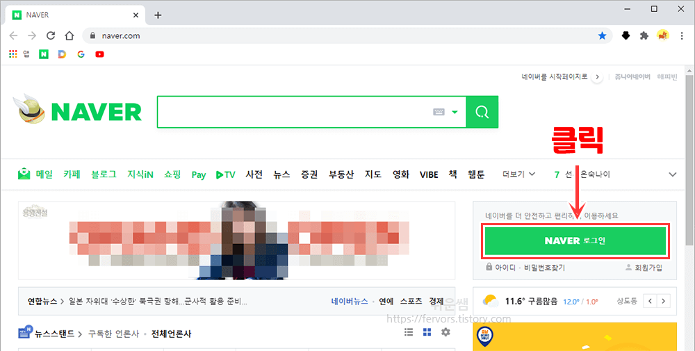1. 컴퓨터에서 네이버 사이트를 열고, 오른쪽의 [네이버 로그인]을 클릭합니다.