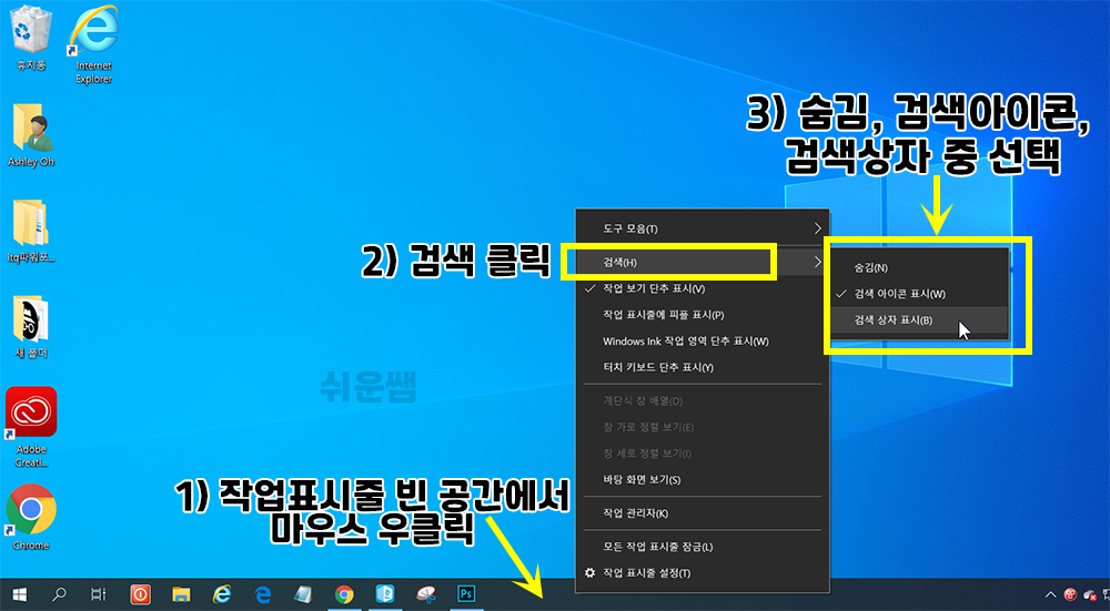 1) 작업표시줄 빈 공간에서 마우스 우클릭을 하고, 2) '검색' 클릭 3) '숨김', '검색 아이콘 표시', '검색 상자 표시' 중 선택합니다.