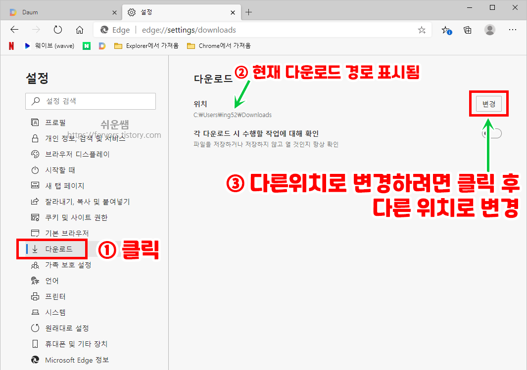 ① 다운로드 위치를 다른 위치로 고정적으로 변경시키기