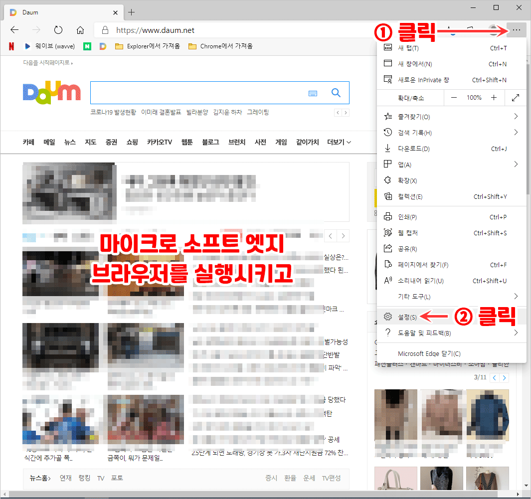 1. 엣지창 오른쪽 상단의 ··· 을 클릭 → [설정]을 누릅니다.