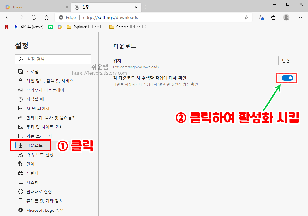 ② 다운로드 위치를 저장할때마다 선택할 수 있도록 변경하기(다른이름으로 저장하기)
