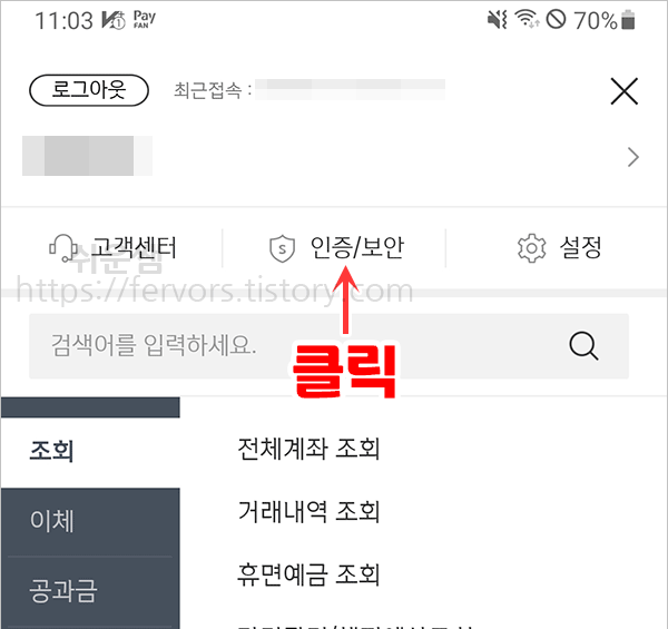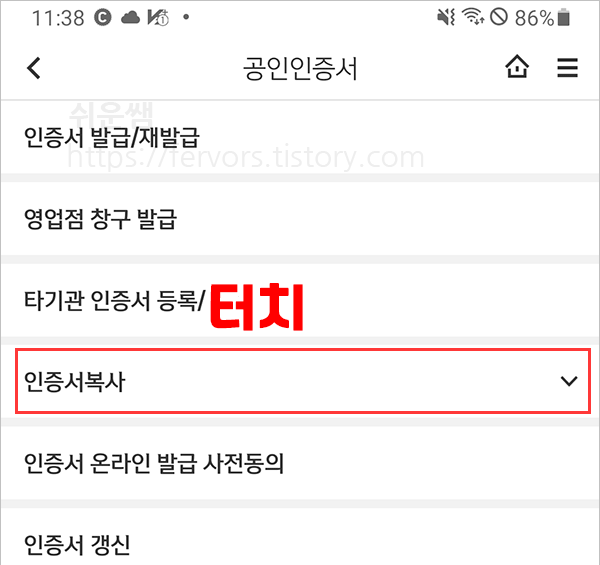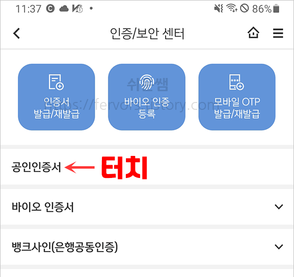 3. 항목 중 [공인인증서] 터치합니다.