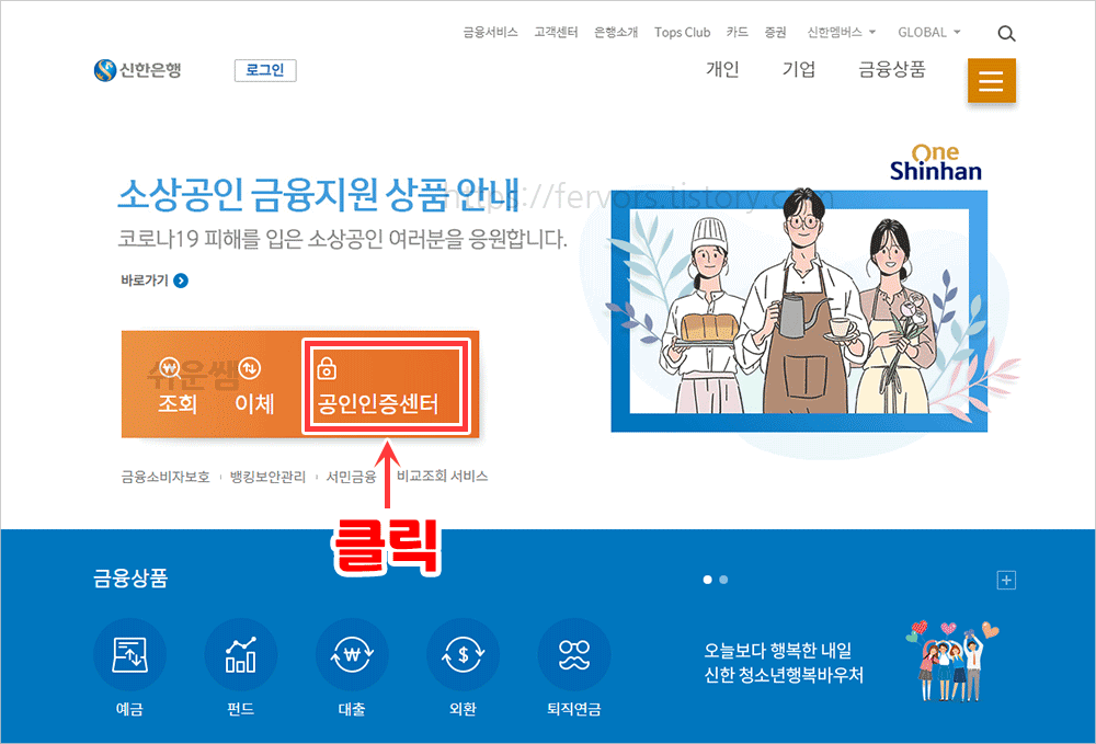 1. 컴퓨터의 신한은행 웹사이트에서 [공인인증센터]를 클릭합니다.