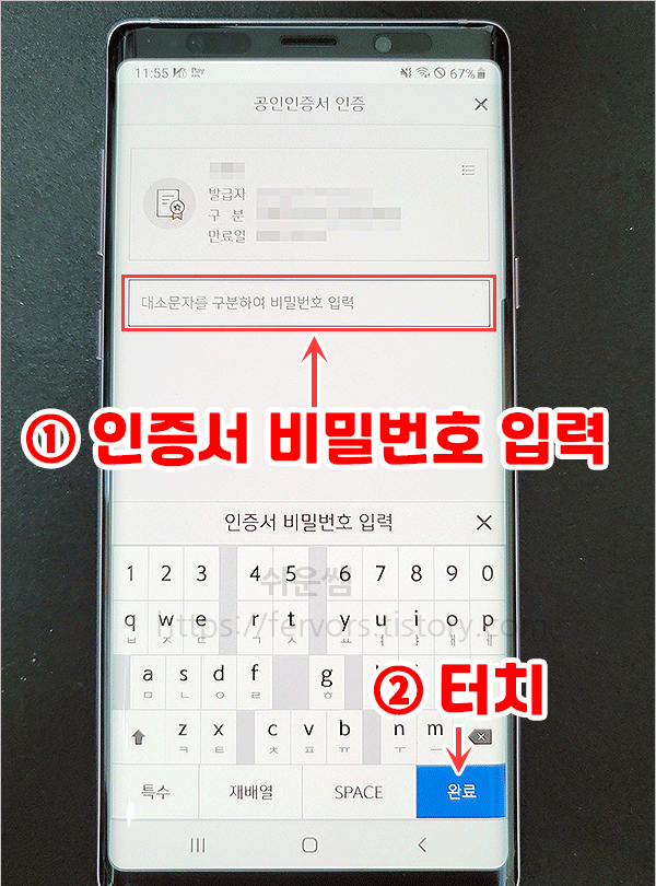 7. 공인인증서 비밀번호를 입력한 후, 완료를 누릅니다.