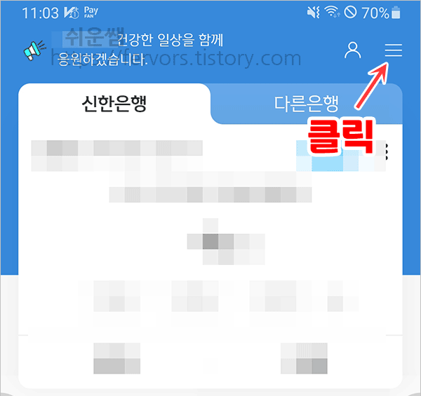 1. 스마트폰의 신한은행 앱인 신한 쏠(SOL)을 열고, 오른쪽 상단 ≡를 터치합니다.