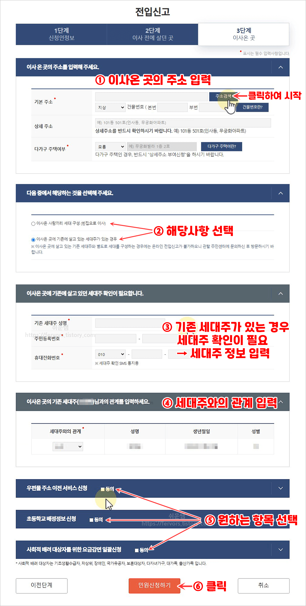 11. 이사 온 곳의 주소, 세대주 정보(필요한 경우에) 및 세대주와의 관계 등을 입력한 후, [민원신청하기]를 누릅니다.