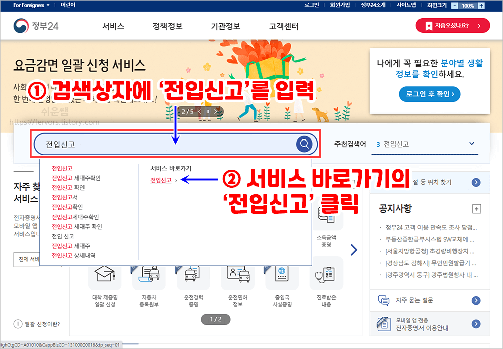 2. 검색상자에 '전입신고'를 입력하면, 아래에 '전입신고'바로가기가 나타납니다. 클릭합니다.