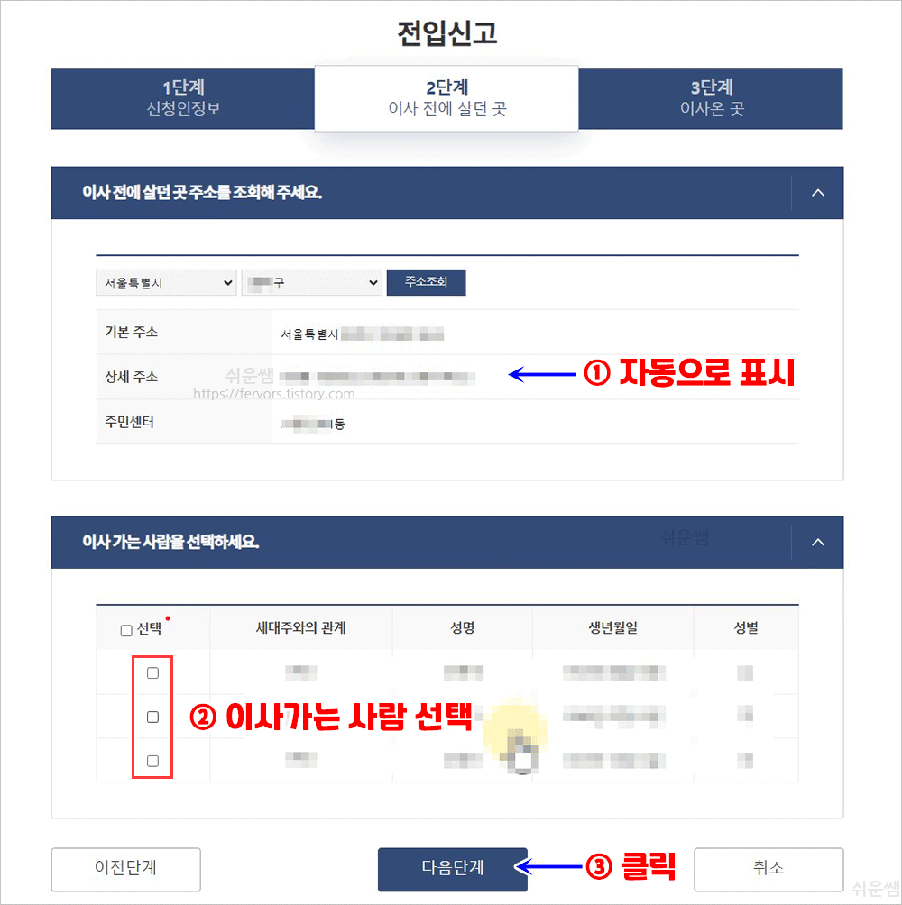 10. 이사 가는 사람을 체크하여 선택하고, [다음단계]를 누릅니다.