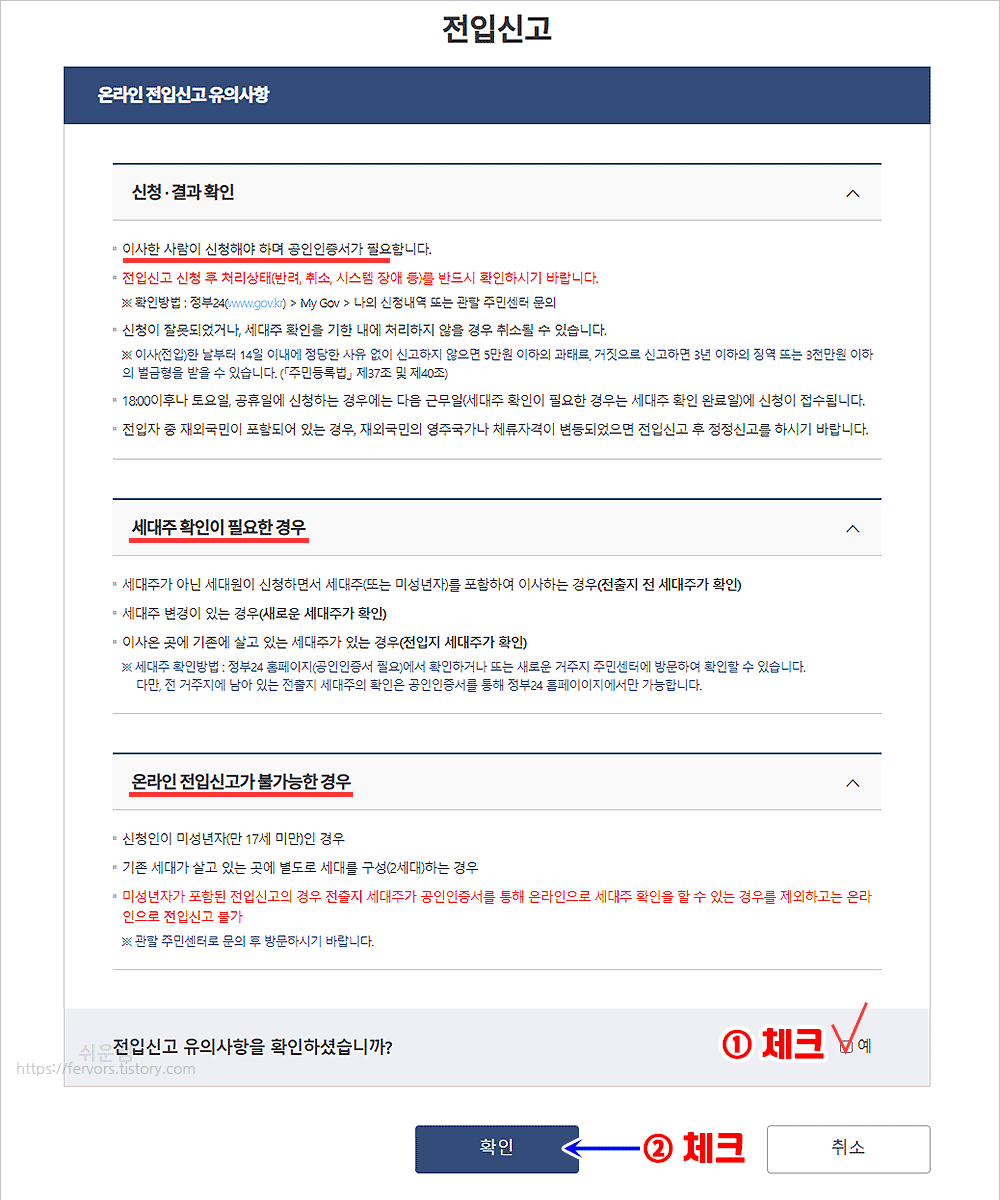 6. 아래 유의사항을 꼼꼼히 읽어보고, [예]에 체크, [확인]을 누릅니다.