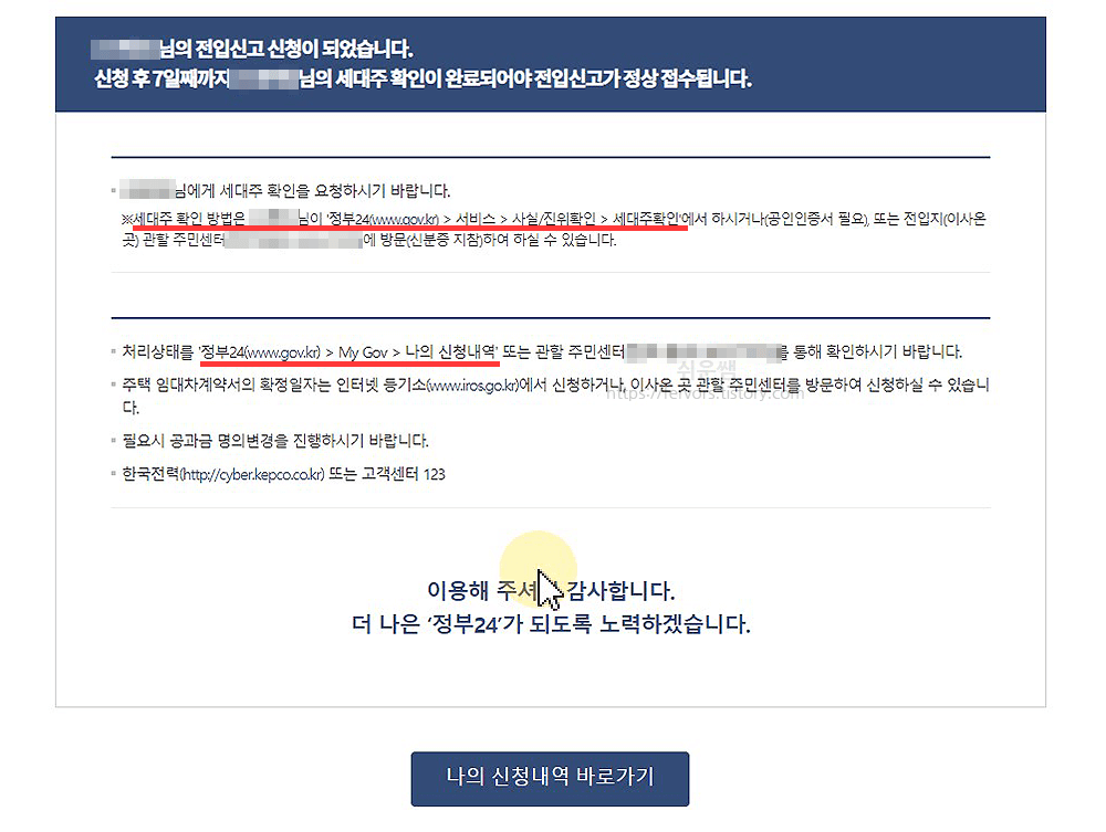 → 세대주에게 문자메시지가 전송되어 알려주며, 세대주가 7일안에 확인하면, [접수 완료]가 되어 민원처리가 시작됩니다.
