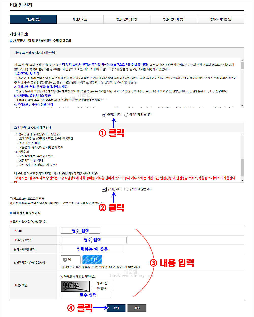 5. '비회원 신청' 정보를 입력하고, [확인]을 누릅니다.
