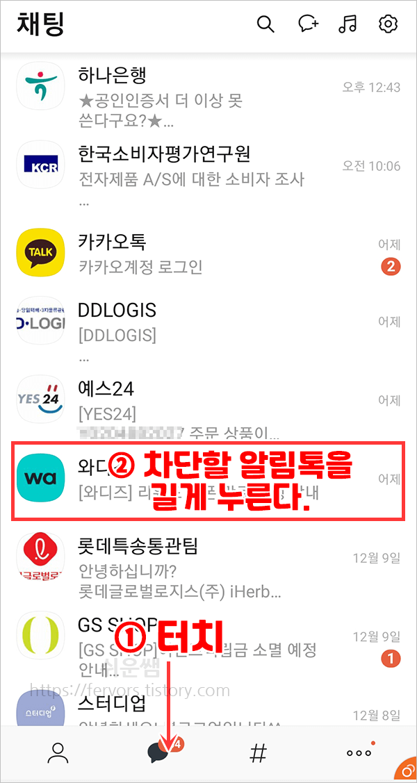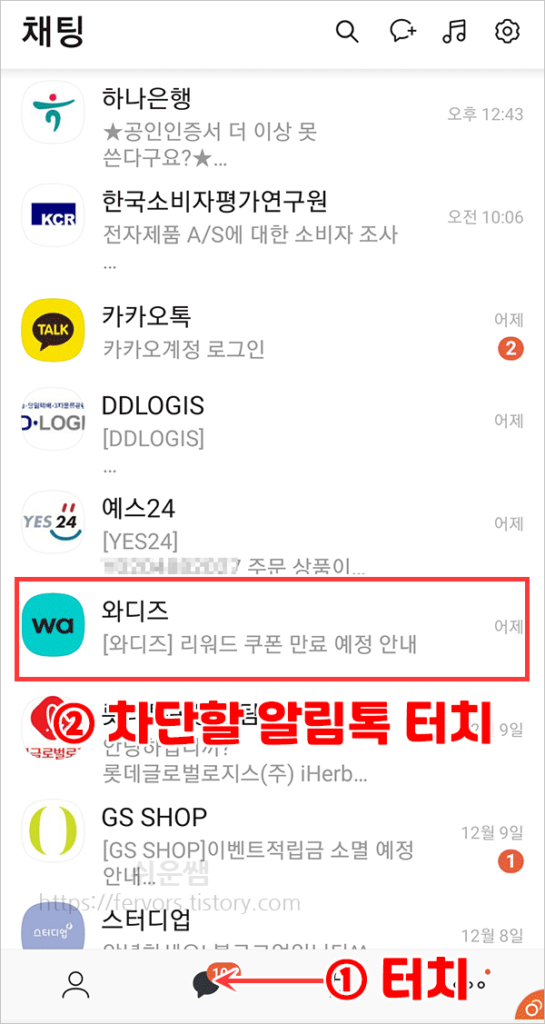 2. 채팅 목록에서 차단할 알림톡을 터치합니다.