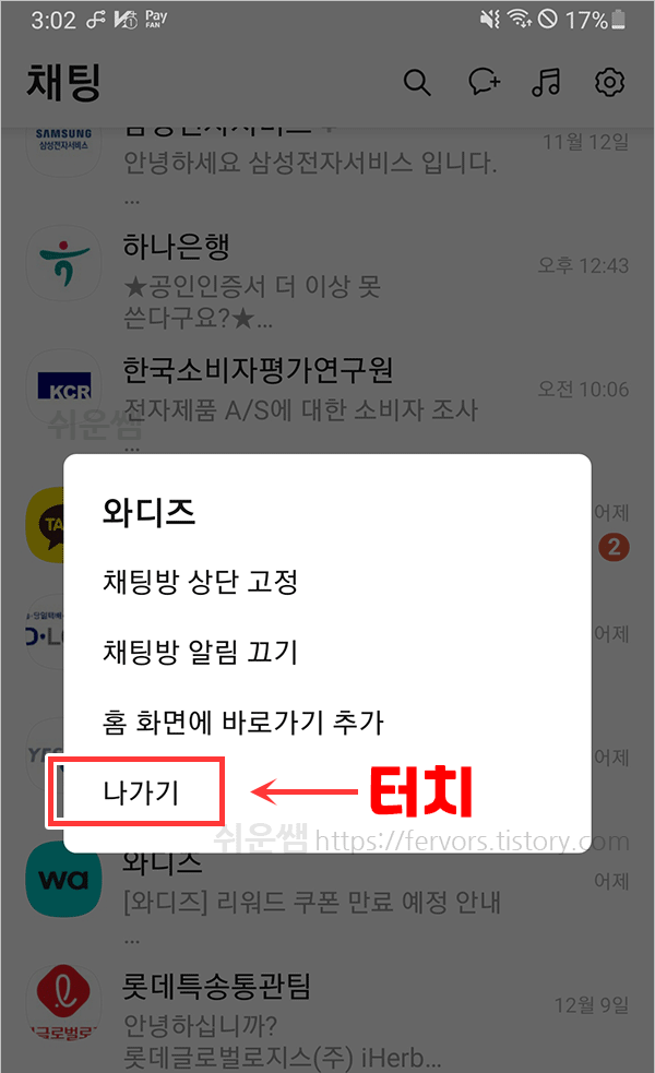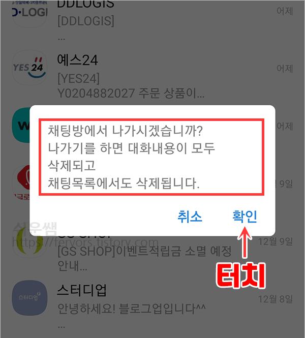 3. '채팅방 나가기'는 해당 톡의 모든 내용이 한 번에 모두 삭제되며, 목록에서도 사라져서 매우 간편한 방법입니다.