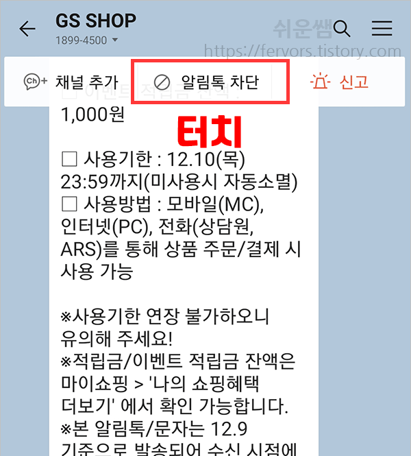 3. 상단의 [알림톡 차단]을 터치합니다.
