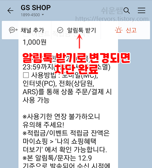 결과) 버튼이 '알림톡 받기'로 변경되면 차단 완료입니다.