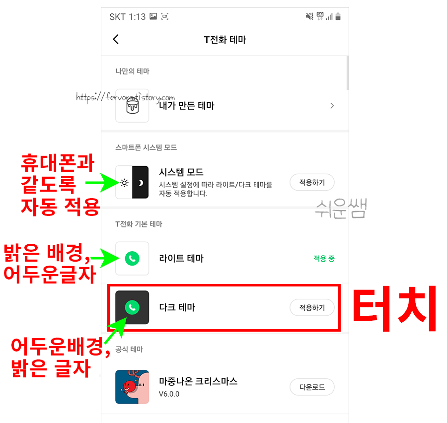 안녕하세요. 쉬운쌤입니다. 저는 눈이 훨씬 덜 부시고 편안해서 다크모드를 선호하고 잘 사용하는 편입니다. 티전화도 다크모드가 가능한데 사용해보니 너무 좋아서 방법을 소개합니다.