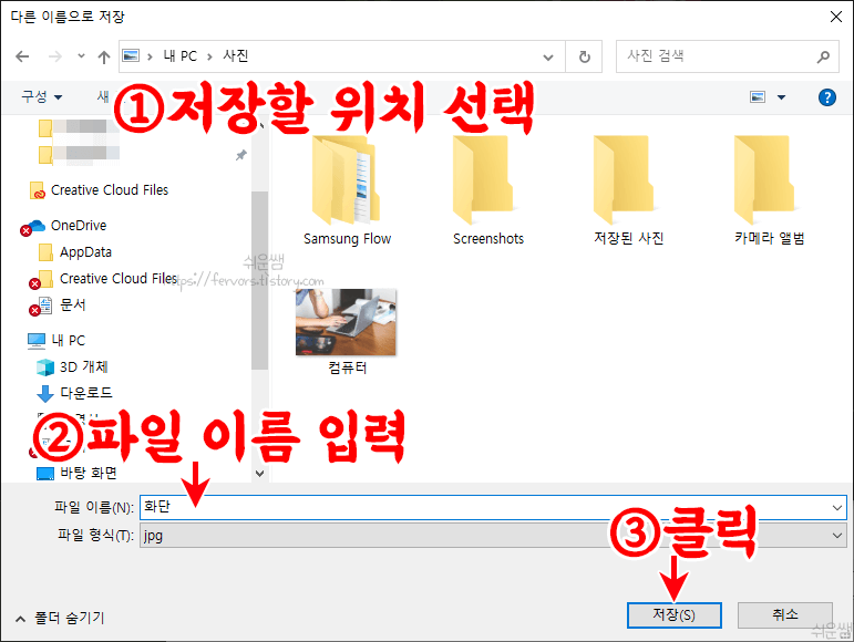 4. 저장할 위치와 이름을 입력하고, [저장]을 클릭합니다. 파일형식은 jpg만 가능합니다.