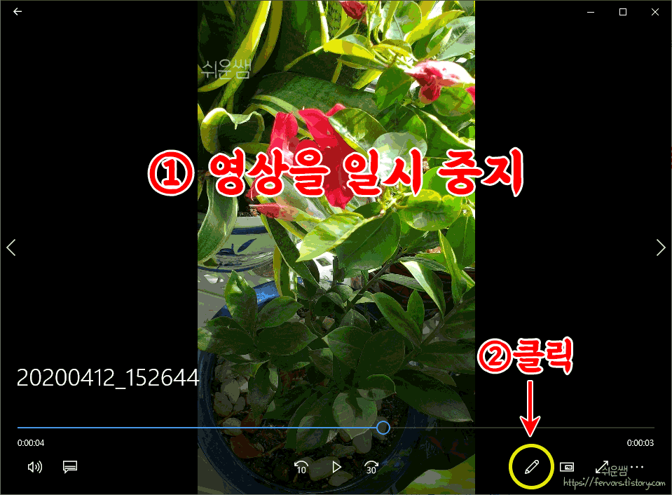 1. 영상이 자동으로 재생됩니다. 영상을 플레이하다가 캡처(장면 추출)할 장면에서 일시 중지를 하고, 오른쪽 아래의 연필모양의 단추를 클릭합니다.