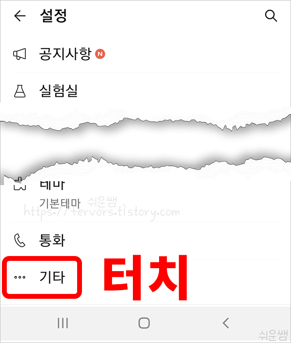 1. 카카오톡 화면 맨아래에서 ··· 을 터치하고, 맨 위에서 [설정]을 터치합니다.
