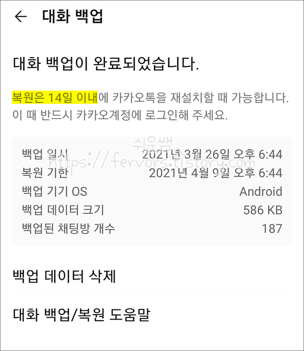 7. 백업이 완료되었습니다. 복원은 14일 이내에만 가능합니다. 복원기한이 표시됩니다.. 그 이후에는 필요하면 다시 백업해야합니다.
