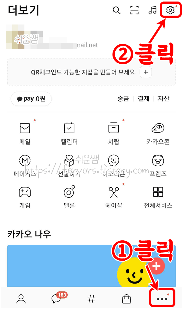 2. 화면 오른쪽 아래 ··· 을 클릭하고, 오른쪽 맨위 설정을 클릭합니다.