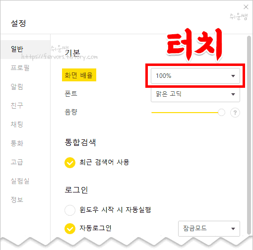4. 화면배율이 100%로 기본 설정되어 있습니다. 터치합니다.