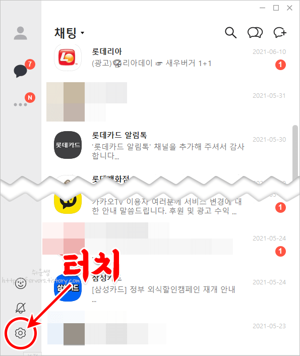 2. 왼쪽 맨 아래의 톱니바퀴 모양의 [설정]을 누릅니다.