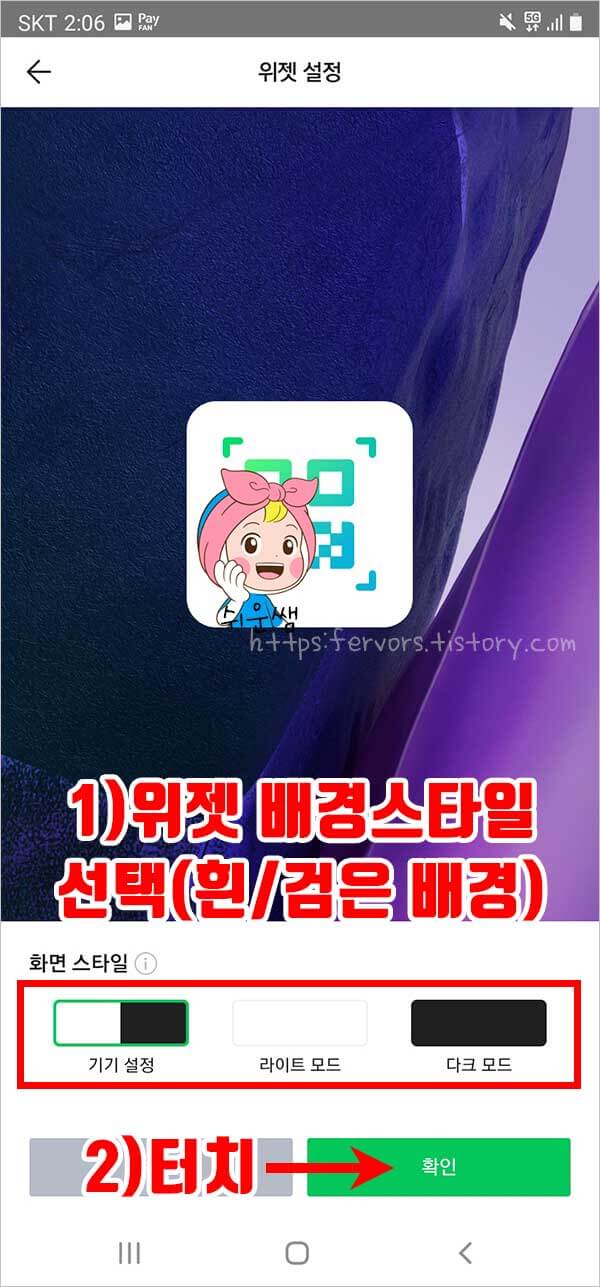 5. 위젯의 배경스타일(밝은, 어두운)을 선택하고, [확인]을 누릅니다.