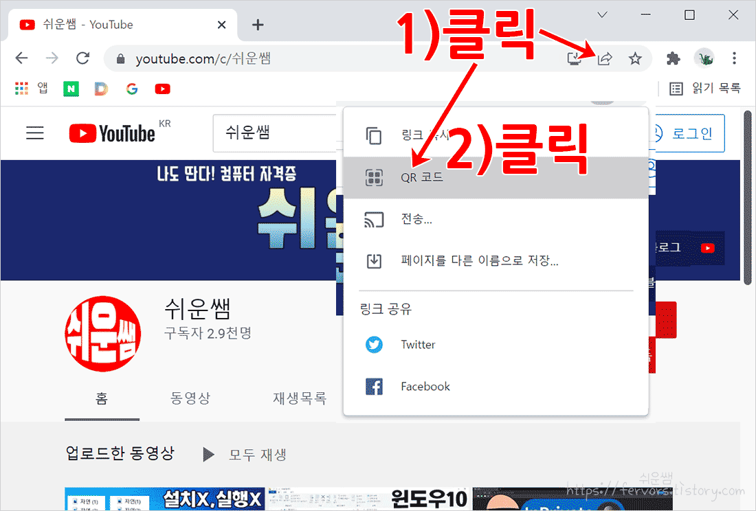 2. 상단 주소표시줄 오른쪽 끝에 '공유'단추를 클릭하고, QR 코드를 클릭합니다.
