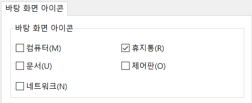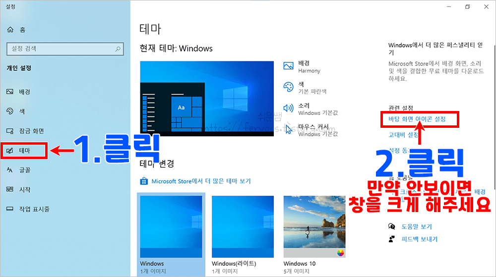 * 만약 [바탕화면 아이콘 설정]이 안보이면... 창을 최대화 하거나, 화면을 움직여서 아래쪽에서 찾아주세요.