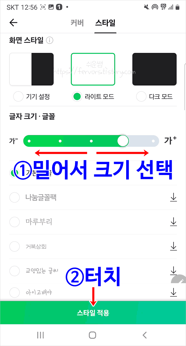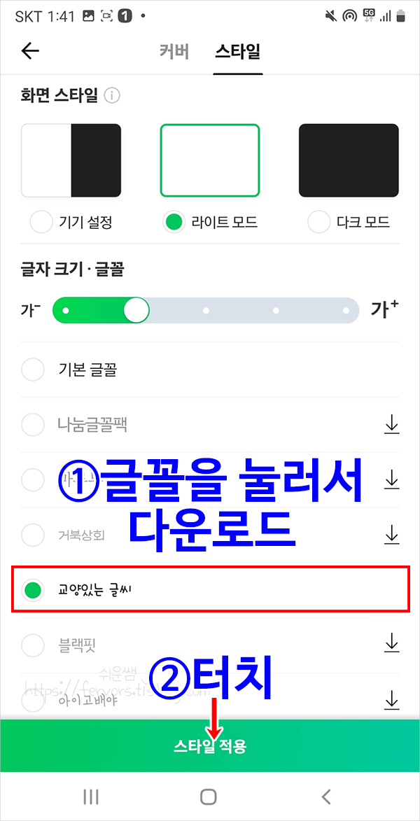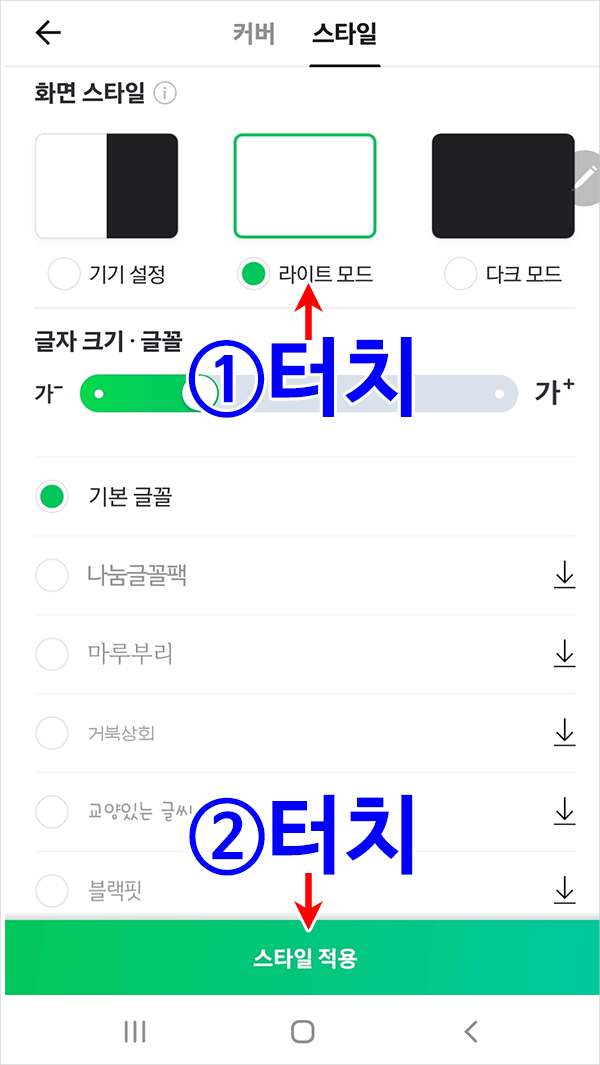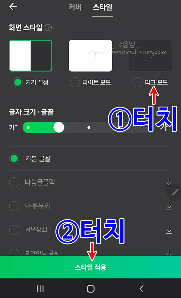 ① 다크 모드 : '다크모드'를 선택하고, 맨 아래 [스타일 적용]을 눌러주세요.