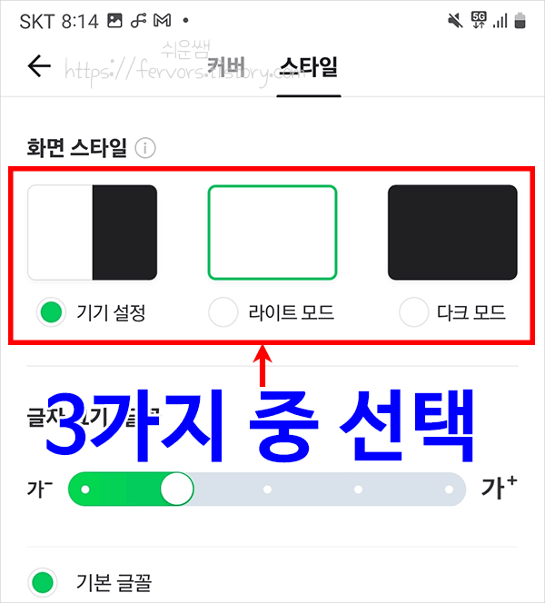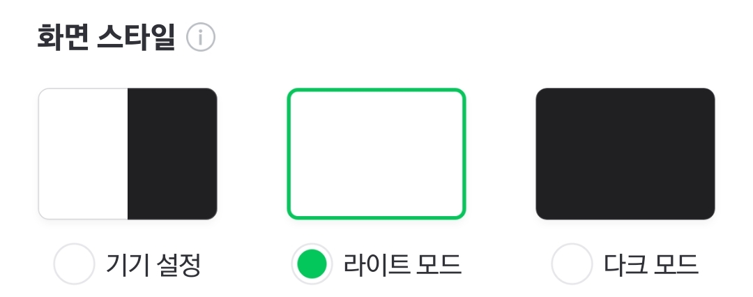5. 3가지 중 화면스타일을 선택합니다. 기본은 '라이트 모드'로 되어있습니다.
