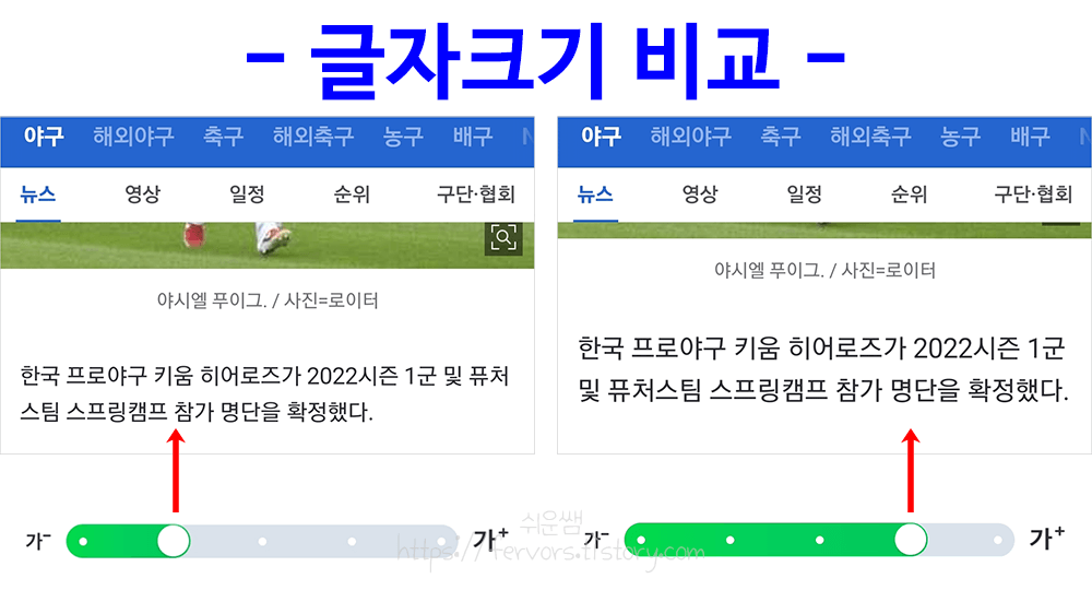 결과 예) 아래와 같이 기사 내용부분은 글자가 커졌고, 상단 메뉴 부분의 글자크기는 변동이 없습니다.