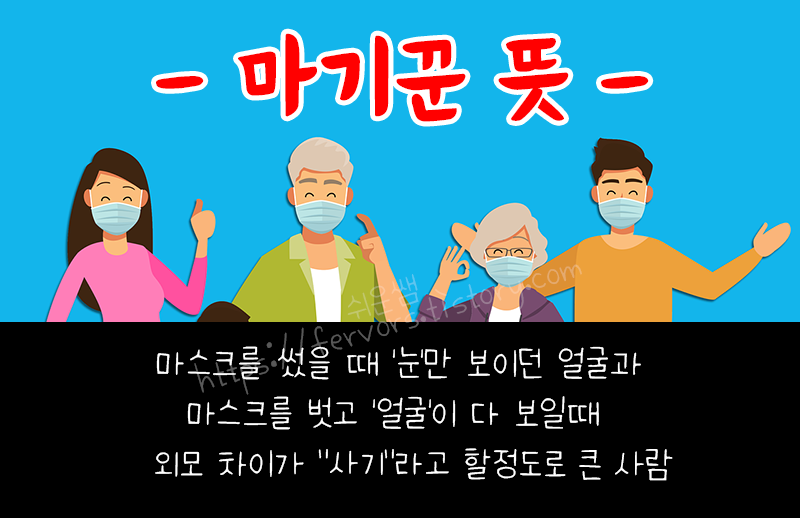 마스크를 써서 눈만 보이던 얼굴과 마스크를 벗어서 전체 얼굴이 보였을 때 상상, 예상, 기대한 얼굴과 차이가 너무 큰 사람을 사기꾼에 빗대어 '마기꾼'이라고 합니다.